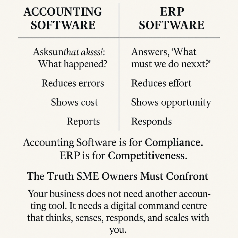 In the daily theatre of business, most SME owners believe they need “a good accounting package.” Something that tallies figures, files taxes, and prints the monthly P&L. They buy software the way one buys stationery—functional, familiar, and comfortably unambitious.